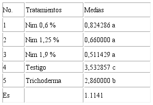 El análisis biométrico arrojó que los tratamientos nim-Trichoderma-testigo presentan diferencias estadísticas significativas. Para el caso de las tres concentraciones de nim no se observan diferencias entre ellas, aunque biológicamente a mayor concentración existe una disminución en el crecimiento micelial de las colonias de Fusarium oxysporum. Con ello se describe el efecto de los tratamientos en las condiciones en que se desarrolló la investigación.