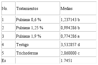 En cuanto a la concentración de 1.9 % de pulsiana y salvia, entre ellas no se muestran diferencias estadísticamente significativas con Trichoderma harzianum, aunque se evidencia biológicamente que con la concentración de pulsiana el diámetro de la colonia del patógeno es ligeramente menor.