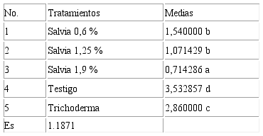 La tabla 3 refleja los resultados estadísticos obtenidos con las concentraciones de salvia analizadas, así como con el control relativo Trichoderma harzianum y el testigo absoluto, donde existieron diferencias estadísticas significativas entre ellas; no así entre las concentraciones 0.6 % y 1.25 %, por lo que a mayor concentración mayor actividad antifúngica. De la misma manera se refleja la actividad antifúngica de Trichoderma harzianum como control relativo, con significación estadística entre ellos.