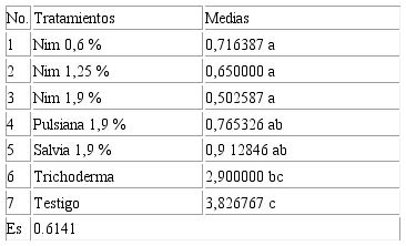 En la tabla 4 se analiza el efecto de las mejores concentraciones de nim, pulsiana, salvia, Trichoderma harzianium y testigos sobre el crecimiento micelial de Fusarium oxysgorum. Se aprecia que existen diferencias estadísticamente significativas de los extractos vegetales en relación con el testigo. Se muestra que de los tres extractos analizados la mayor acción inhibitoria para la cepa de Fusarium oxysporum la obtuvo el extracto de nim en todas sus concentraciones, al igual que el comportamiento con T. harzianum.