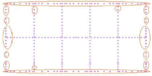 El análisis modal muestra que para todas las variantes se presentan reacciones de tracción que dependerán mucho de la zona de ubicación de estas. Las reacciones de tracción varían considerablemente con el número de pisos y no varían significativamente al aligerar las cargas muertas (Tabla 1). La zona de propagación de las reacciones de tracción determina tres niveles bien definidos de comportamiento sísmico, que permiten diferenciar estas variantes (Tabla 2). Un nivel para el cual la zona de propagación de las reacciones de tracción es extensa, que aparece de color gris oscuro en la Tabla 2, y que abarca todo el contorno del edificio y parte de las cimentaciones interiores con valores extremos altos de reacciones de tracción (aparecen circulados en la Figura 2). Un nivel de transición para el cual la zona de propagación de las reacciones de tracción abarca solo zonas críticas del contorno del edificio, con valores de reacciones de tracción mucho más bajos (color gris claro). Por último, un nivel para el cual la zona de propagación de las reacciones de tracción resulta muy limitada o prácticamente no existe, con valores de probables reacciones de tracción muy bajos (color blanco).