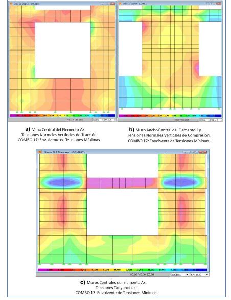 Una comparación de las tensiones normales verticales máximas en la mampostería del primer piso muestra que generalmente las tensiones de compresión son mayores que las de tracción, excepto en zonas muy puntuales de las esquinas de los vanos de elementos transversales interiores. Valores del mismo orden a los anteriores se registran en elementos transversales exteriores en zonas próximas a las esquinas del edificio y en las esquinas de vanos interiores del elemento longitudinal de fachada (Figura 3a y 3b). El análisis de las tensiones tangenciales muestra que los máximos absolutos aparecen en los muros anchos interiores del elemento longitudinal de fachada (Figura 3c).
