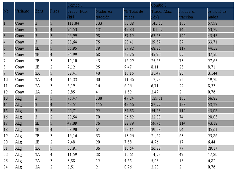 Los parámetros de control anteriores no permiten establecer con claridad un criterio que diferencie estas variantes por su comportamiento sísmico. Las reacciones de tracción en la base son un parámetro de control que refleja la magnitud de las demandas sísmicas y un indicador importante de riesgo sísmico, porque supone, además, incrementos considerables de las presiones en el suelo en la cara opuesta a donde estas se presentan.