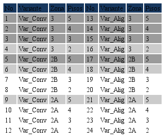 Así, basado en un proyecto arquitectónico único (Figura 1a) que utiliza la mampostería reforzada, se pueden definir proyectos racionales diferentes para cada una de las zonas sísmicas del país según la norma sísmica cubana NC 46:1999 (Cuba. Comité Estatal de Normalización, 1999). Se generaron variantes de edificios de viviendas de 2 a 5 pisos de mampostería reforzada que se construirán en las zonas de moderada o acusada peligrosidad sísmica de la región suroriental de Cuba (Zonas 2A, 2B, 3), donde se esperan valores máximos de aceleración del terreno entre 0,15 y 0,3 g. Estas variantes se analizaron para dos soluciones de recubrimientos de piso e impermeabilización de cubierta: una convencional, denominada “Pesada”, y otra con materiales y tecnologías que reducen el peso muerto, denominada “Aligerada” (Peña, 2011, Álvarez y Peña, 2012).