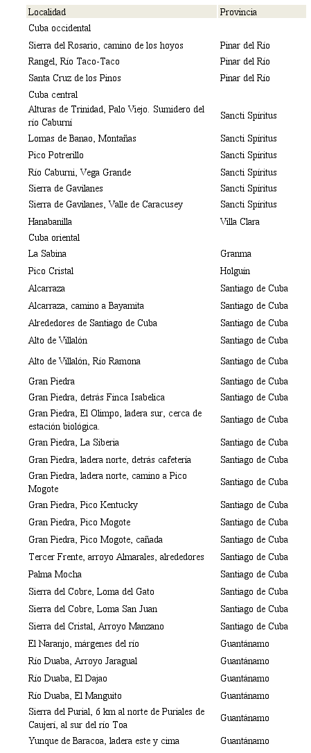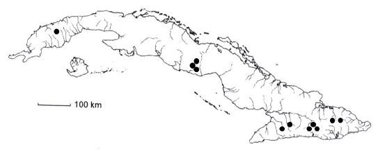 Muestras examinadas: Pinar del Río, Sierra del Rosario, Camino de los Hoyos, orillas del manantial, 350 msm, terrícola, s. f., Caluff, 513, 3847, BSC. Sancti Spíritus, Pico Potrerillo, bosque pluvial, 700-830 msm, terrícola, 26-III-1985, Caluff, 515, 5097, BSC; Río Caburní, Vega Grande, 450-600 msm, rupícola, 28-III-1985, Caluff, 523, 5234, BSC; Márgenes del río Caburní, Sierra del Escambray, 600 msm, rupícola, 8-VI-1984, Caluff, 519, 4067, BSC; Trinidad, Alturas de Trinidad, Palo Viejo, Sumidero del río Caburní, terrícola, 21-X-1993, Calzada, 22603, BSC. Granma. La Sabina, 900 msm, bosque nublado, terrícola, 15-X-1979, T. Pócs & D. Duany 9076/S, BSC. Holguín. Pico Cristal, Mayarí, 500-600 msm, pinar, hojarasca, 14-II-1989, A. Motito & K. Mustelier 504, 12940, BSC. Santiago de Cuba. Camino a Bayamesa, Alcarraza, 500-600 msm, bosque pluvial, terrícola, 28-I-1989, A. Motito, 527, 12833, BSC; Gran Piedra, Cañada Pico Mogote, 900-1050 msm, bosque pluvial, terrícola, 4-III-1985, K. Mustelier & A. Vicario, 520, 4399, BSC; Sierra del Cobre, Loma del Gato y alrededores, 950 msm, bosque pluvial, rupícola, 11-VII-1921, Hno. León, 531, 10121, BSC; Sierra de La Gran Piedra, oeste del Pico Kentucky, 1050 msm, pluvisilva montana, terrícola, 2-XI-1980, Pócs & Caluff, 9207/AT, BSC; Gran Piedra, Olimpo, ladera Sur, 1050 msm, bosque siempreverde, rupícola, 29-X-1980, Pócs & Caluff 9198/E, BSC; Camino a Bayamita, Alcarraza, 500 msm, bosque pluvial, terrícola, 28-I-1989, A. Motito, 498, 12843, BSC; Sierra de La Gran Piedra NE de Santiago de Cuba, en el valle cerca del Alto de Villalón, 400 msm, bosque siempreverde, rupícola, 12-V-1979, Pócs & D. Reyes 9101/A, BSC; Gran Piedra, Detrás de la Isabelica, 1100 msm, bosque pluvial, rupícola, 29-X-1980, Pócs & Caluff 9199/AD, BSC. Guantánamo. Sierra del Purial, 6 km al N de Pluviales de Caujerí, al Sur del río Toa, 600-650 msm, bosque semideciduo, terrícola, 22/10/1980, Pócs, D. Reyes & M. Caluff 9185/AG, BSC.