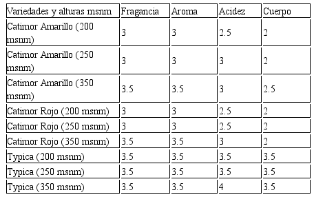 Las muestras de café de las variedades Catimor rojo y amarillo a las alturas de 200 y 250 msnm presentaron propiedades organolépticas similares, mientras que a una altura de 350 msnm hubo un ligero incremento de la acidez y el aroma (Tabla 8). Esto se debe fundamentalmente a que cuando aumenta la altura se produce un proceso más lento de la maduración; por tanto, una mayor formación de azucares y ácidos orgánicos, que son los elementos fundamentales para el aroma y la acidez del café.