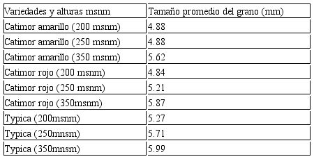 La tabla 1 muestra las variedades de café utilizadas en la investigación, así como las correspondientes alturas con respecto al nivel del mar, mientras que en la segunda columna se expone el tamaño promedio del grano luego de la selección al azar de 10 granos de café, que son medidos y promediados. Como se puede observar en la tabla, el tamaño del grano es mayor a medida que aumenta la altura en que se encuentra el cultivo.
