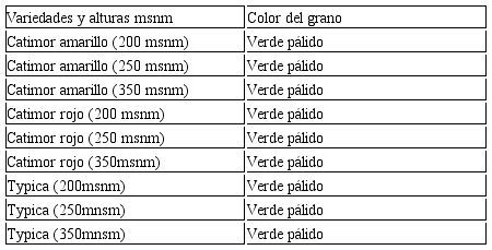Wintgens (2004) plantea que los granos producidos a más altitud poseen una piel verde-grisácea y baja acidez, fenómeno que es normalmente acompañado por una distorsión y decoloración de las hojas terminales (efecto cálido y efecto frío). El color del grano de café oro varía de acuerdo con la región y altura donde se produce; sin embargo, puede alterarse radicalmente con elevadas temperaturas.