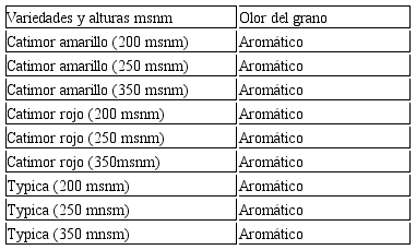 El olor del grano es una de las características más importantes para evaluar si el café es de buena calidad o no. En la tabla 5 se muestran las variedades de café y sus respectivos aromas. Cuando un café posee un olor agradable es muestra de que ha sido beneficiado de manera adecuada, los granos no han sufrido la incidencia de plagas y enfermedades y poseen buen contenido de humedad.
