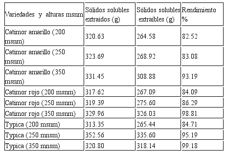 Buscando un parámetro que relacione los sólidos solubles extraíbles con sólidos solubles extraídos, se utilizó una misma proporción de 200 ml de agua y 10 gramos de café. Con un papel de filtro fue filtrada cada una de las muestras, a las cuales se les tomaron tres muestras de 25 ml; se evaporaron en una estufa a 105 °C, se enfriaron y se volvieron a pesar. Los resultados se anotaron y se volvieron a colocar en la estufa por 5 minutos más, repitiéndose dos veces esta operación hasta obtener un peso constante.
