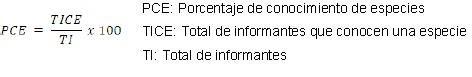 Obtenida la información se evaluaron indicadores etnobotánicos, teniendo en cuenta algunos de los utilizados por Mesa (1996) y Monroy y Ayala (2003). Las fórmulas utilizadas en el cálculo de los indicadores seleccionados se muestran a continuación: