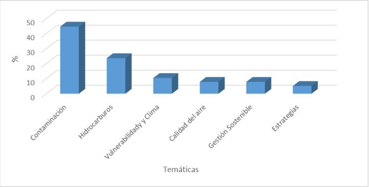 Entre 2000 y 2018 de los estudios encontrados el 50 % hace referencia a la contaminación de compuestos orgánicos y caracterización de los residuales de las principales empresas que vierten a la bahía y la presencia de metales pesados. Un 20 % declara sobre hidrocarburos, grasas, aceites y las diversas técnicas empleadas para su evaluación. En menor proporción se incluyen temas sobre cambio climático, estrategias ambientales y gestión sostenible (Figura 2).