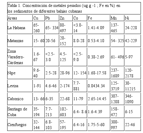 En varias bahías cubanas fue monitoreada la presencia de metales pesados, los resultados se muestran en la (Tabla 1). Las más contaminadas son las bahías de Santiago de Cuba y La Habana (Chabalina y Beltran, 2008).
