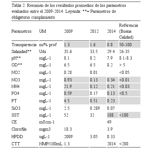 Regadera et al., (2009) y Regadera et al. (2014) evaluaron gran variedad de indicadores físicos, químicos y bacteriológicos en aguas superficiales y a 8 m de profundidad en ambos períodos estacionales. Un resumen de los resultados se muestra en la tabla 2. Las cuadrículas sombreadas no cumplen con los valores establecidos por la norma NC:25/1999 (Oficina Nacional de Normalización, 1999), escogida como referencia.
