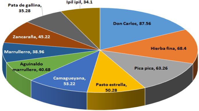 Las arvenses que han incrementado su presencia son pasto estrella y hierba fina con 20 y 15.5 %. Dos disminuyen sus valores: ipil ipil con 5.6 % y camagüeyana con 6.5 %, manteniendo una frecuencia de aparición por encima del 34 %.