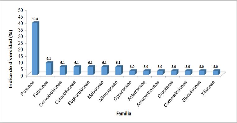 Al analizar el índice de diversidad de las familias de arvenses en el área de estudio (Figura 2), se observa que la familia Poaceae presenta el mayor índice de diversidad relativa, con 39.4 %, al agrupar 12 especies, seguida de la Fabaceae. Los menores índices los muestran las familias Cyperaceae, Asteraceae, Amaranthaceae, Cruciferae, Commelinácea, Steculiaceae, Tiliaceae, todas con un 3 %.