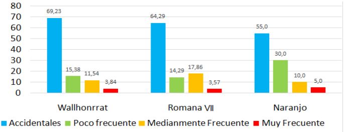 En cuanto a la frecuencia de aparición los tres lotes que conforman la unidad (Figura 3) muestran el predominio de las arvenses en la categoría accidentales, con valores entre 55 a 69.23 % del área total, seguidas de las poco frecuentes con valores de 10 hasta 15.38 %, las medianamente frecuentes con valores desde 30 a 11.54 % y, por último, las muy frecuentes con valores de 5 a 3.84 %.