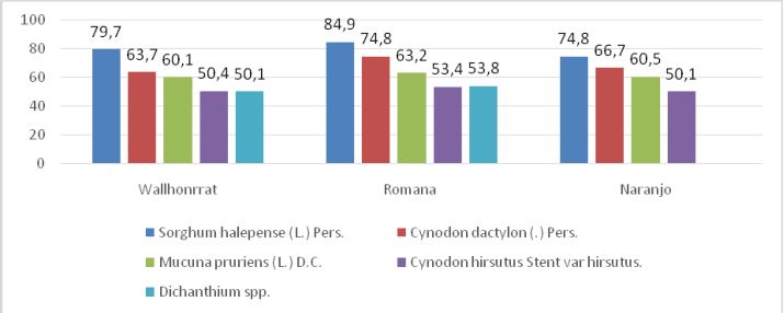 En la figura 1 se revelan las 10 arvenses con frecuencia de aparición superior al 25 % en el área en estudio: una en muy frecuente, el don Carlos (Sorghum halepense (L.) Pers., con 87.56 %. Medianamente frecuentes: hierba fina (Cynodon dactylon (L.) Per.), pica pica (Mucuna pruriens (L.) D.C.), camagüeyana (Dichanthium spp.) y pasto estrella (Cynodon hirsutus Stent var hirsutus.) con 68.40, 63.26, 53.22 y 50.28 % respectivamente. Poco frecuentes zancaraña (Rottboellia cochinchinensis (Lour.) Clayto.) 45.22 %, aguinaldo marrullero (Ipomoea trifida (Kunth) D. Don.) 40.68 %, marrullero (Ipomea tiliacea (Willd.), pata de gallina (Digitaria adscendens (Kunth) Henr.) e ipil ipil (Leucaenaleucocephala subsp.) con 38.96, 35.28 y 34.1 % respectivamente.