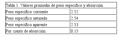 Con el objetivo de conocer el peso específico (corriente, saturado y aparente), así como determinar la capacidad de absorción de agua, se realizaron estos ensayos conforme a la NC 186: 2002 (Cuba. Oficina Nacional de Normalización, 2002). para el árido fino. Los resultados se muestran en la tabla 1.