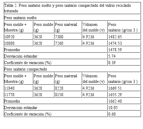 Los pesos volumétricos se determinaron por medio de pesadas del material contenido en recipientes calibrados de volumen conocido al vidrio reciclado triturado. Antes de determinarlos, las muestras se secaron a una temperatura que oscilaba entre 105 - 110 oC, hasta un peso constante. Los resultados pueden consultarse en la tabla 2.