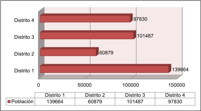 En la figura 1 se muestra la distribución de la población en cada uno de los distritos de la ciudad, en ella se observa que el Distrito 1 es el más poblado (34,93 % del total de la población de la ciudad) y el menos poblado es el Distrito 2 (15,23 % del total de la población de la ciudad).