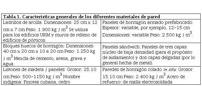 En la tabla 1 se muestran las características generales de los diferentes materiales de pared utilizados en la construcción de las edificaciones. Esta caracterización incluye las dimensiones de las piezas que conforman los muros, así como su peso específico.