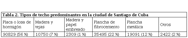 En la tabla 2 se relacionan los tipos de techo que predominan en la ciudad y se contabiliza la cantidad de edificaciones por cada tipo.