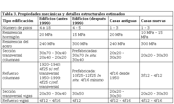 La calidad de las propiedades mecánicas y detalles estructurales de los edificios y viviendas se estimaron a partir de encuestas realizadas (Tabla 3).