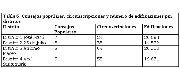 Desde el punto de vista administrativo la ciudad está dividida en cuatro distritos urbanos. En estos distritos actualmente viven de forma permanente alrededor de 399 860 personas en un total de 87 377 edificaciones (tabla 6).