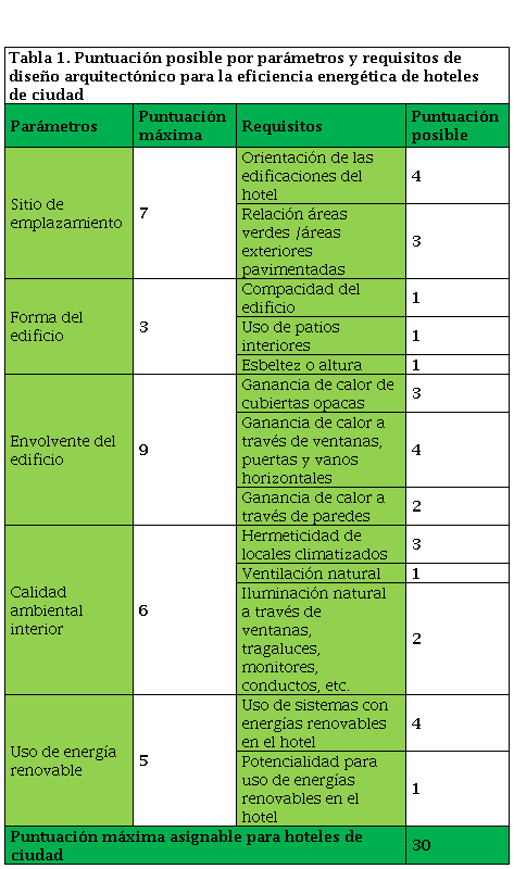 Como resultado de un análisis de los métodos de evaluación sustentable en la categoría energía a escala internacional y tomando como punto de referencia la Norma Cubana 220-1: 2009 en la mencionada guía de evaluación, se definieron los requisitos y parámetros de diseño arquitectónico (Figura 1) para la evaluación del uso eficiente de la energía en hoteles de ciudad.