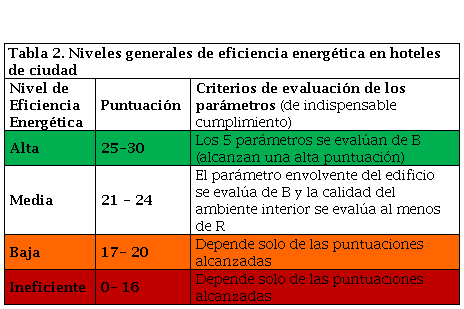 Para la determinación del nivel general de eficiencia energética de un hotel de ciudad en relación con los parámetros y requisitos de diseño arquitectónico de la eficiencia energética se proponen los niveles y criterios que se muestran en la tabla 2. Los requisitos de diseño del edificio y los niveles de puntuación asignados a estos pueden variar según la temática arquitectónica.