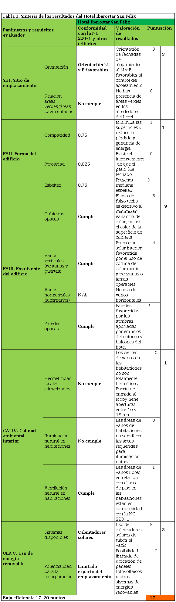 La evaluación de los parámetros y requisitos de diseño arquitectónico que intervienen en la eficiencia energética del hotel Iberostar San Félix de la categoría 4 estrellas evidencian que el mismo se evalúa con un nivel de eficiencia energética bajo (Tabla 3, Gráfico 1).