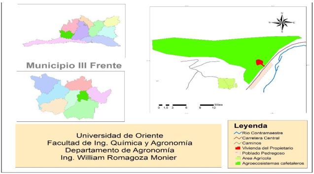 El trabajo se realizó en la Finca Pedregosos, caracterizada por ser un sistema agroforestal cafetalero de 25 años con una superficie total de 28 ha dedicadas al cultivo del café. La finca pertenece a la Cooperativa Jesús Menéndez en el Municipio Tercer Frente de la provincia de Santiago de Cuba y se encuentra ubicada en las coordenadas 20° 18' de latitud y 76° 15' de longitud (Figura 1).