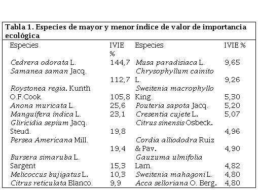 En la tabla 1 se muestran los resultados del Índice de Valor de Importancia Ecológica (IVIE). Las especies con los valores más altos fueron Cedrera odorata L, Samanea saman Jacq., Roystonea regia Kunth. Se evidencia la abundancia, dominancia y frecuencia no recomendada del cedro sobre el resto de las especies. En nuestro país se recomiendan 30 cedros por hectárea debido a la característica semicaducifolia de la especie.