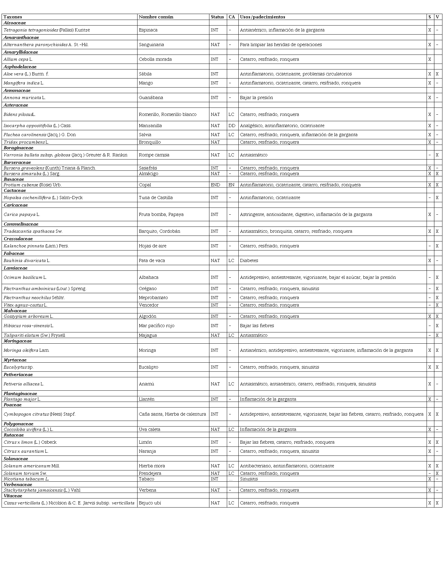 Se listaron 39 especies con usos relacionados con enfermedades respiratorias, diabetes o paliativas. Estas pertenecen a 26 familias. En este inventario se detectaron 23 especies introducidas, 15 nativas, un endemismo evaluado como En Peligro (EN), 10 con Preocupación Menor (LC), y una como datos deficientes (DD) (Tabla1).