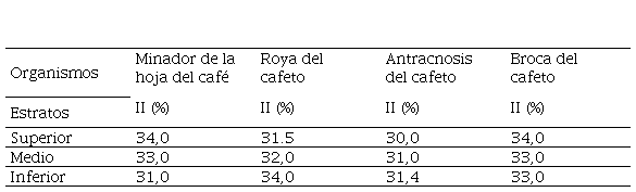 Al estudiar los resultados de las evaluaciones en el campo se constató, en cuanto a la distribución espacial del complejo parasítico que afecta el sistema del cafeto en la planta, que no existe diferencia respecto a la presencia de los organismos evaluados en los tres estratos, según las condiciones experimentales en las que se desarrolló el trabajo (Tabla 1).