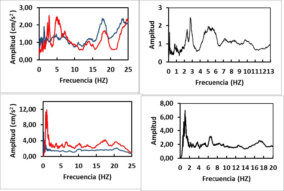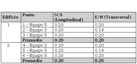 Del análisis de los espectros se obtiene que las dos edificaciones estudiadas poseen un período fundamental de 0.20 segundos; para los resultados donde se utiliza el método de la FFT (Fast Fourier Transform), transformada rápida de Fourier. Con la técnica de Nakamura (Nakamura, 1989) el período fundamental obtenido para las edificaciones es de 0.20 y 0.19 segundos respectivamente; la similitud de los resultados permite validar los métodos usados y demostrar que son correctos los resultados obtenidos.