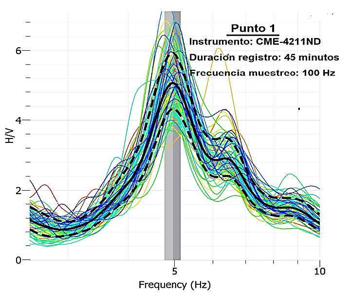 En el gráfico anterior se muestra la curva H/V media resultante (línea continua negra) y las curvas de confianza (líneas negras discontinuas). En la intersección de las dos bandas grises se encuentra la frecuencia natural (f0) en el punto de medición, obtenida mediante este método.