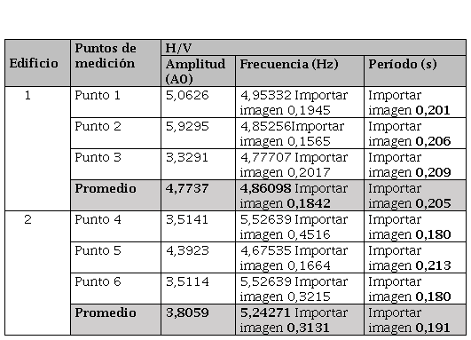 Luego se aplicó el cociente espectral H/V Método de Nakamura (Nakamura, 1989) para cada punto de medición en la azotea, buscando eliminar las vibraciones de altas frecuencias y resaltar el periodo fundamental de los edificios (tabla 2)