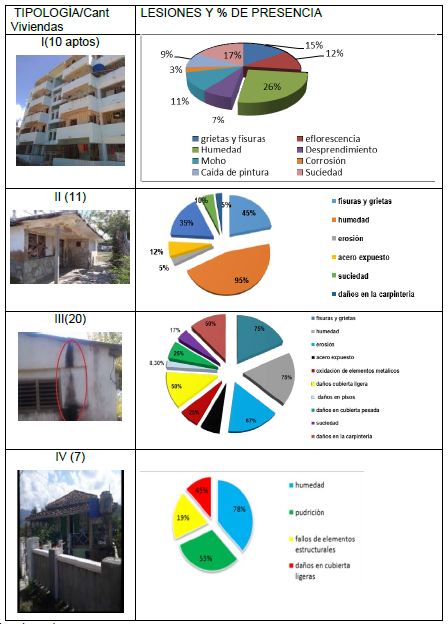Como se observa existe el predominio de la humedad, erosión, grietas, aceros expuestos, pudrición y la mayoría de las lesiones secundarias producto a la presencia de agua en los elementos estructurales y no estructurales de los inmuebles ( vigas , columnas, losas, balcones, cornisas y otros), lo cual corrobora la hipótesis de que aun en los casos con acciones de mantenimiento, las verdaderas causas de la presencia de las lesiones no han sido debidamente atendidas, los materiales utilizados no son los adecuados y no se consideró el ambiente costero tan agresivo. Todo lo anterior sustenta la hipótesis de la realización de diagnósticos incorrectos y desconocimiento comunitario en temas de acciones constructivas en la zona. La humedad es una lesión común y dañina para los inmuebles, sobre todo cuando están presentes las sales y cloruros provenientes del mar.