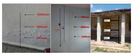 Como primer paso se definieron los puntos de mediciones, primeramente, es necesario aclarar que en este trabajo se hace referencia a la realización de dos tipos de mediciones, una se realizó en paredes desde el suelo hacia la losa con tres puntos de medición y la otra, desde la losa hacia el suelo con tres puntos de medición en el caso de las tipologías I y II, para las tipologías III y VI se midió en tres puntos solo en paredes. (Figura 4).