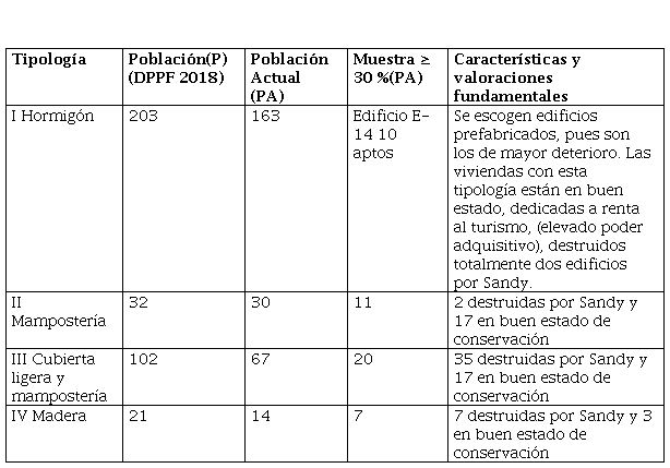 Con el paso del huracán Sandy por Santiago de Cuba, el asentamiento Siboney, marcó un punto de inflexión en el sector de la vivienda, donde se dañaron inmuebles y un gran número fueron totalmente destruidos. Cada una de las tipologías se afectaron de manera diferente, por lo que, para el estudio, en cada caso hubo que definir criterios de selección, siempre teniendo en cuenta un porciento en dependencia de la población actual (≥ 30%). (Tabla 1)