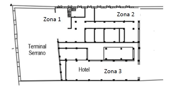 A estas dos áreas se les une la zona 1 que corresponde a la antigua Terminal Serrano, aunque no pertenece al edificio principal, va a formar parte del nuevo hotel, además de estar unida físicamente a este. Caracterizada por tener un solo puntal de aproximadamente 6m de altura, con luces que oscilan entre los 3.40 m y 4.80 m. En esta área la cubierta es una losa de hormigón armado sobre un sistema de vigas metálicas apoyadas en un extremo sobre el muro perimetral y en el otro, sobre columnas de hormigón armado.