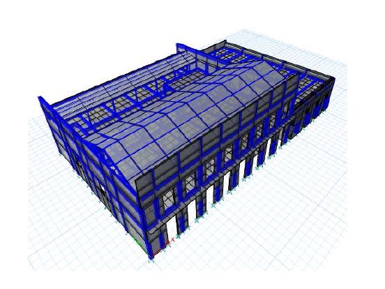 Este paso se realiza basado en la geometría del edificio obtenida del levantamiento planimétrico y altimétrico, y se tiene en cuenta en la modelación, las secciones transversales y la longitud de cada elemento. Las columnas y vigas se modelan como elementos lineales, los muros de fachada y las losas de entrepiso son considerados como elementos “Shell”, debidamente discretizados para la transmisión de las cargas y para poder lograr mejores resultados en la respuesta, (figura 3).