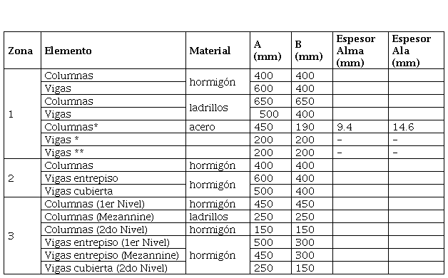 Las secciones transversales de los elementos estructurales (columnas, vigas) se obtienen del levantamiento arquitectónico de la edificación realizado por la Emproy-15, y se resumen en la tabla 1 mostrada anteriormente.