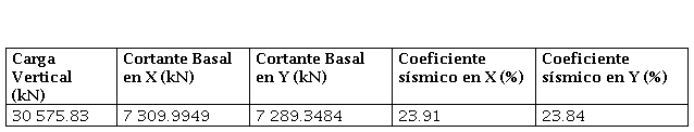 Se verifica que participen en la respuesta dinámica, más de un 90% de la masa del edificio. Otro parámetro importante en el análisis es el peso de la estructura, el coeficiente sísmico y la fuerza cortante que se produce en la base, aspecto que se incumple ya que los coeficientes superan el 20 % de lo que recomienda el código (IBC), ver tabla 3.