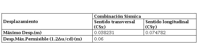 En la tabla 4 se exponen los resultados de los desplazamientos absolutos en el tope del edificio para las diferentes combinaciones de cargas, actuando el sismo en las dos direcciones principales, donde se aprecia que se superan los valores de desplazamientos admisibles del edificio, según el código cubano NC-46: 2017 (Comité Estatal de Normalización, 2017, p. 79).