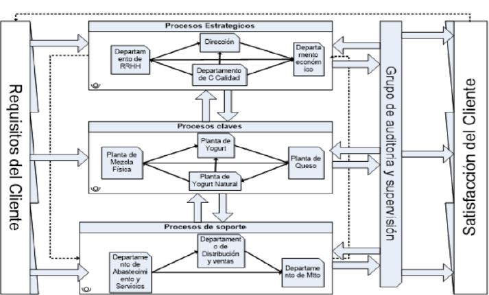 La unidad funcional escogida, resultado del cálculo de la huella de carbono, es la tonelada, toneladas de CO2 equivalentes al año (tCO2e/a) emitidas por los procesos antes mencionados y generadas por la UEB Combinado Lácteos Santiago de Cuba, dependiendo en cada caso de cuál sea el GEI que se cuantifica. Aunque la UEB realizó su proceso de perfeccionamiento empresarial hace algunos años, no cuenta con una representación gráfica de sus procesos, por tal razón se propone un diseño del mapa de procesos de la UEB (Gráfico 2).