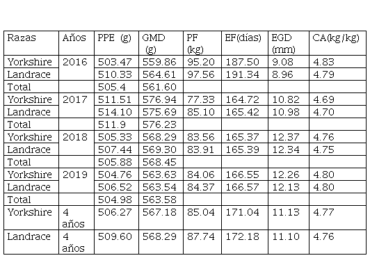 Cuando se analizó el espesor de la grasa dorsal (EGD) la diferencia entre años fue mínima con rango entre 9.08 y 12.37 milímetros con media para los cuatro años de 11.13 mm y el 2018 el mejor año en este parámetro. En el indicador CA (conversión alimentaria kg/kg) los valores tomaron mínimos de 4.69 y máximos de 4.83 y se obtuvo un promedio de 4.77 entre los cuatro años y el mejor valor se registró en el 2016. En la raza Landrace el indicador peso por edad (PPE en gramos) alcanzó un rango de 506.52 g – 514.10 g para una media de 509.60 g siendo el 2017 el mejor año para la raza Landrace.