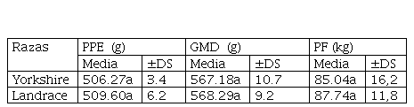 Keywords: cochinatas Yorkshire and Landrace, productive acting, I weigh for age, thickness of the dorsal fat, alimentary conversion.